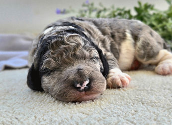 Puzzle's dam is Darsee, an AKC and APR registered standard Blue Merle Poodle. His sire is Moose, an ACHC registered F1b silver standard Goldendoodle.